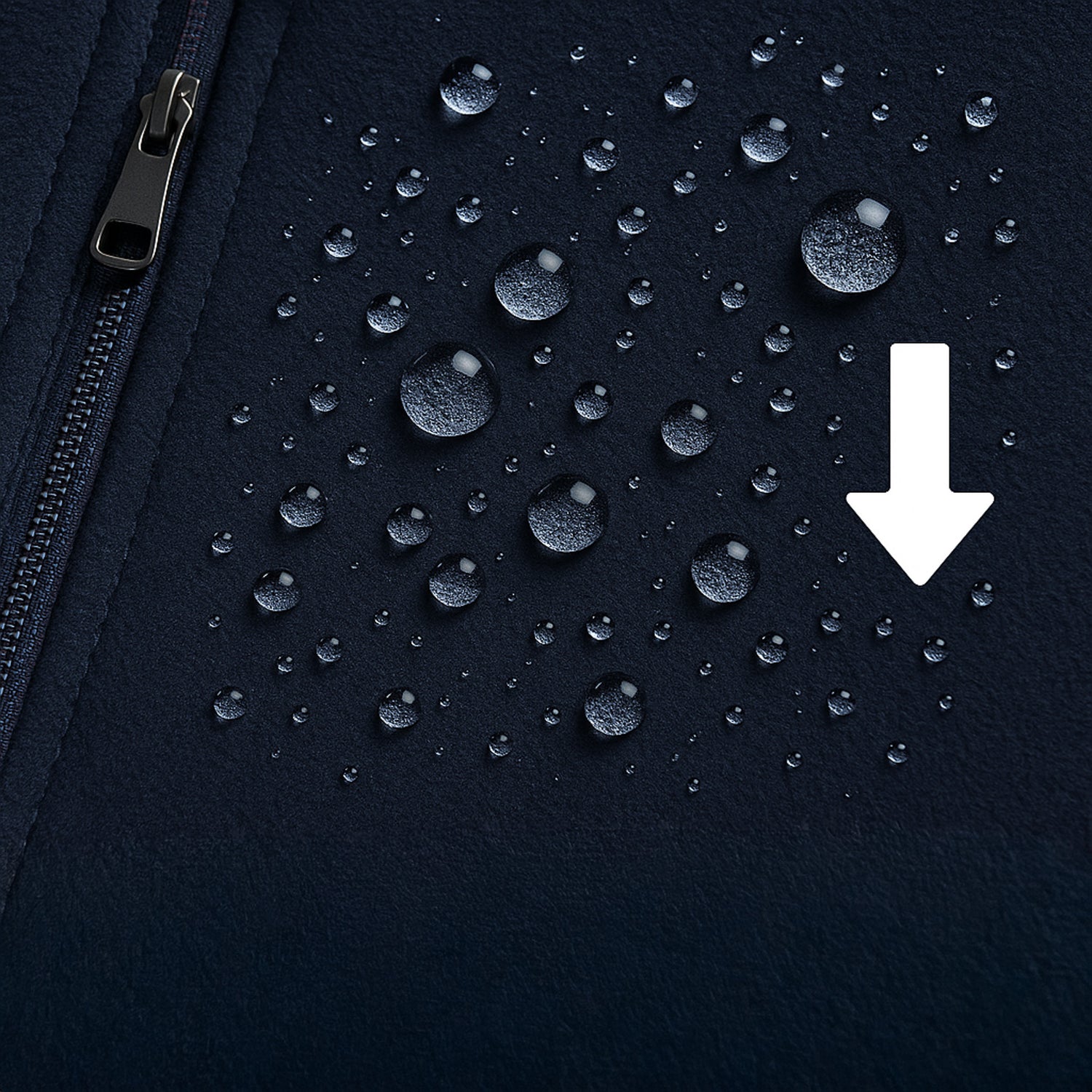 The exterior is coated with a durable hydrophobic polymer layer (DWR). This treatment makes water bead up and roll off the fabric instead of absorbing in. Combined with the structure of the polyester shell, moisture cannot saturate the fibers.